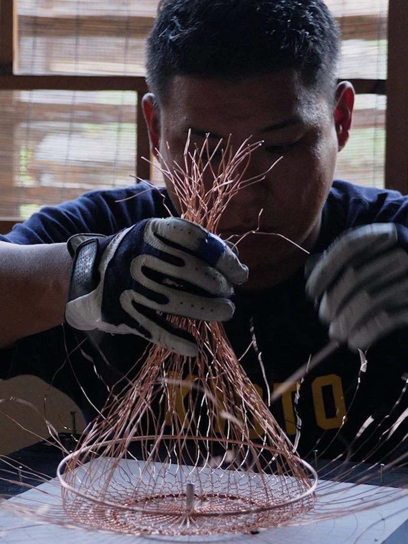 Succeeding to the craft of Kyo-kanaami (traditional metal-knitting), he embarked on direct marketing through a retail shop at Kodaiji, Kyoto, as well as online sales. He collaborated with domestic and overseas major manufacturers and brand creators, and his activities as both businessman and craftsman symbolize traditional methods pointing towards the future. With the creative concept of ‘dignity of supporting items’, he cherishes traditional techniques passed from former ages while posing challenges through new types of object-making.